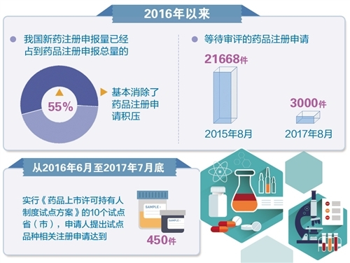 2016年以來,我國新藥注冊申報量已經占到藥品注冊申報總量的55%,基本消除了藥品注冊申請積壓,等待審評的藥品注冊申請已由2015年8月份的21668件降至2017年8月份的3000件。抗生素和疫苗臨床試驗申請、中藥民族藥注冊申請也已實現按時限審評。