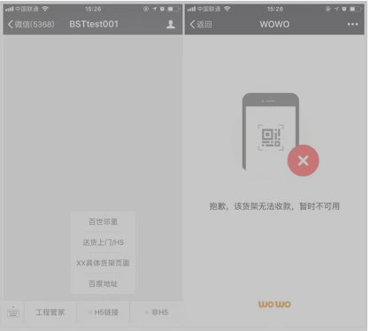 億邦動力網隨后查看了百世店加、百世鄰里等官方微信號,均未找到“貨架”入口,但卻在百世店加旗下的另一個公眾號“BSTtest”中發現了一點“痕跡”。該公眾號中設有入口“XX具體貨架頁面”,點擊進入后,頁面顯示“貨架暫時無法收款”,而頁面中出現的“WOWO”字樣也疑似貨架的落地地點——百世集團在去年收購的WOWO便利店。