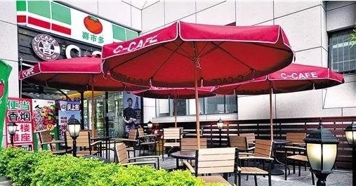 在便利店的店門外,撐幾把帶有品牌logo的遮陽傘,再擺幾把藤桌藤椅,一個既可以裝飾門店外觀,又易于清潔移動的室外休閑區就打造完成。非常適合店面不大卻又需要休閑區的便利店。
