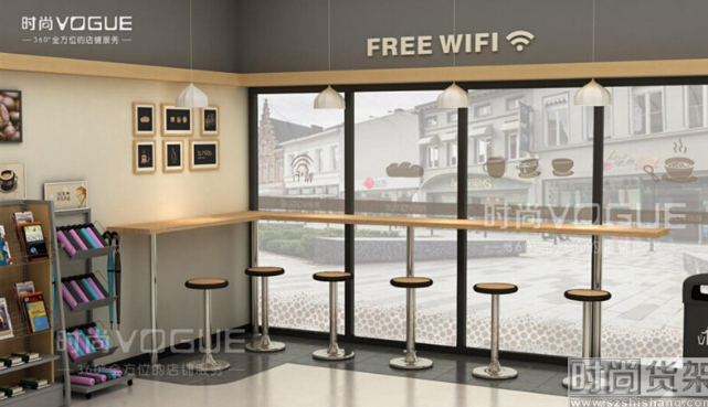 櫥窗吧臺是一種常用的休閑區打造方式。使用這款時尚貨架設計的,可以根據櫥窗大小定制長度的吧臺,加上幾把高腳凳,既不會占用過多便利店空間,還顯得簡約雅致。
