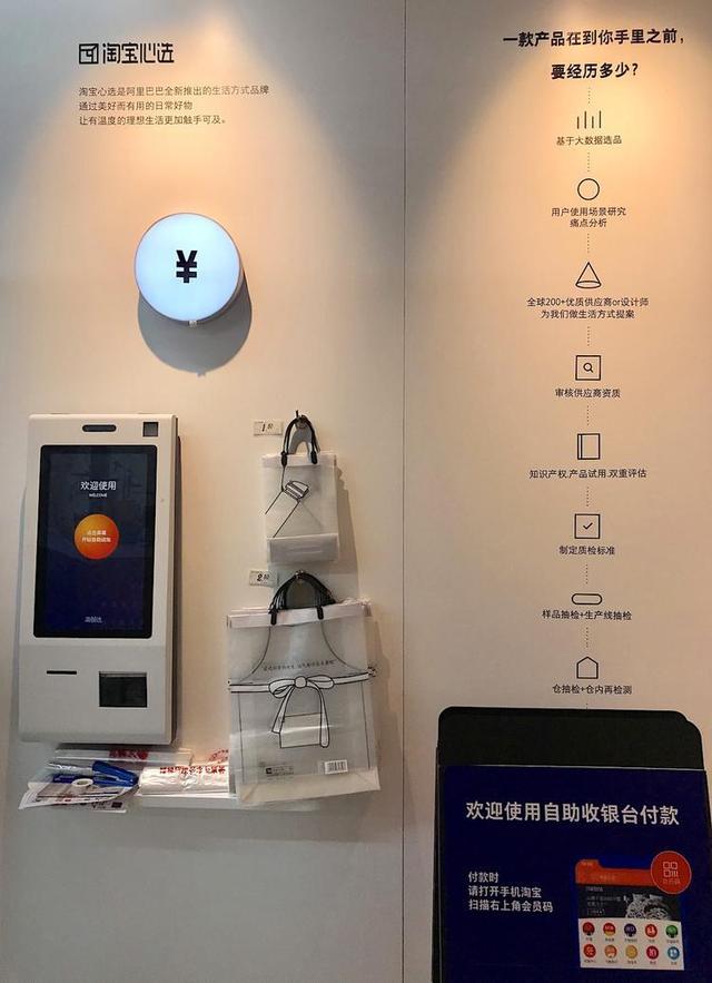 這家店也在著力突顯“智能”和“數(shù)字化”——門口有一個(gè)自動(dòng)販賣機(jī),開業(yè)第一天,附近的居民不少來排隊(duì)領(lǐng)取免費(fèi)的購(gòu)物袋。店面盡頭有一個(gè)自助結(jié)賬機(jī)器,需要打開淘寶掃描會(huì)員碼,也可以在大潤(rùn)發(fā)收銀臺(tái)結(jié)賬。這家店 3 公里周邊消費(fèi)者也可以在手機(jī)淘寶和大潤(rùn)發(fā)優(yōu)鮮 APP 上選購(gòu)淘寶心選的商品,有 1 小時(shí)到家的配送服務(wù)。