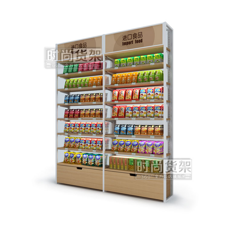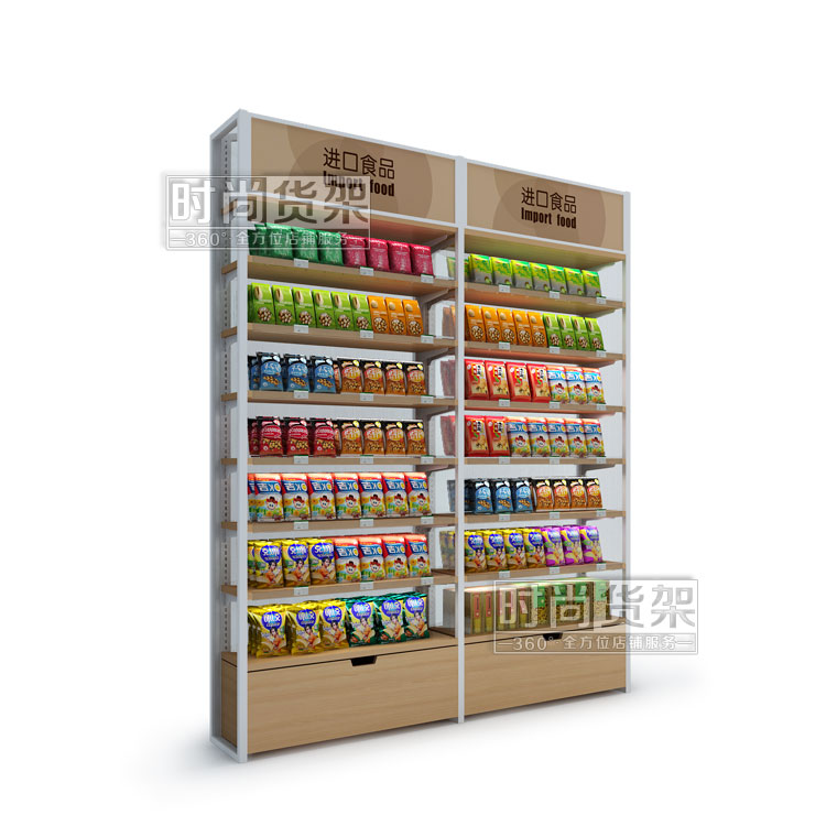 【特點】透光性強的輕便陽光背板、環(huán)保高檔的木質(zhì)層板,打造出了這款精制時尚的高檔食品貨架。頂部廣告牌的設(shè)計很好地對商品進行分類指示,引導顧客更好地購物,底部的地柜設(shè)計也十分巧妙,增加了貨架整體的儲物功能,將便利店空間更合理地利用了起來。