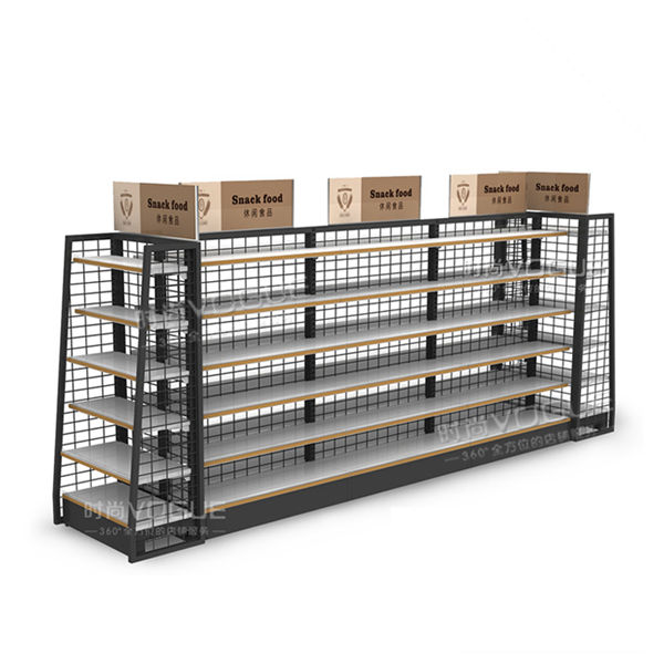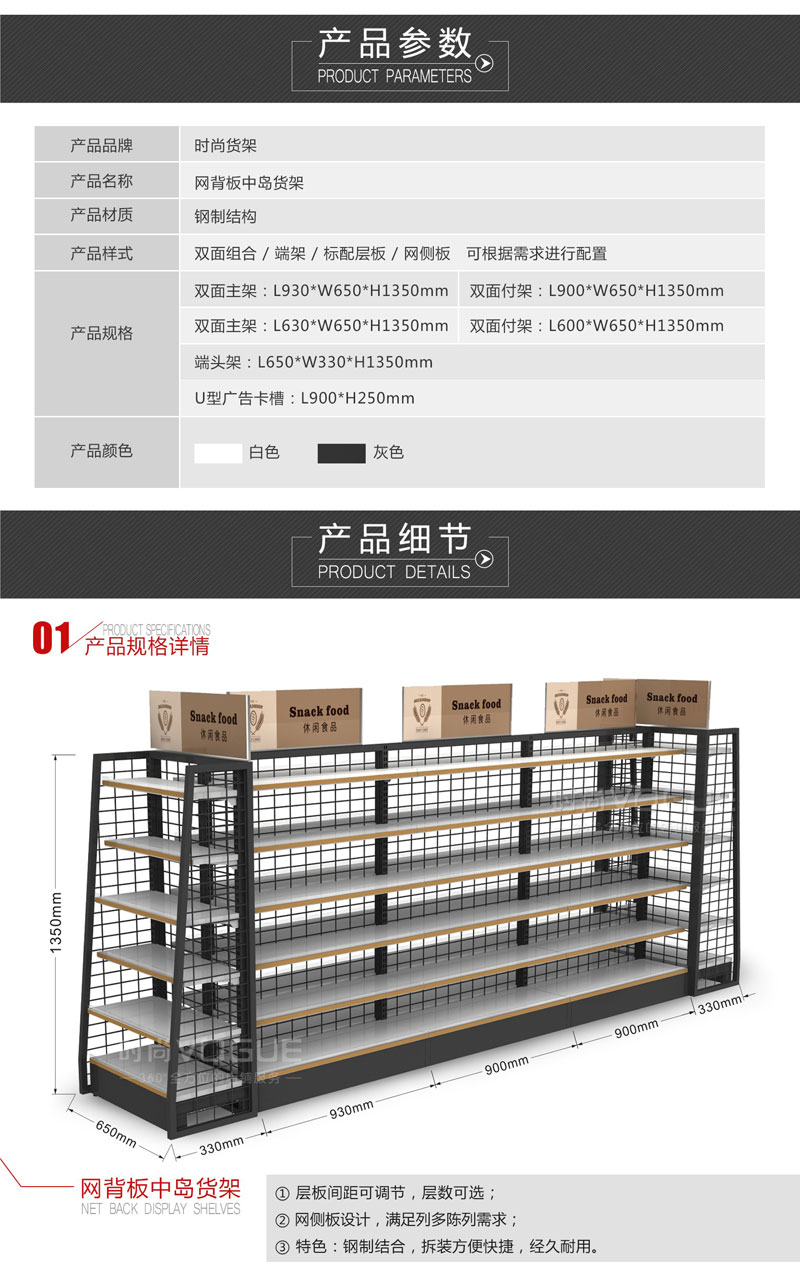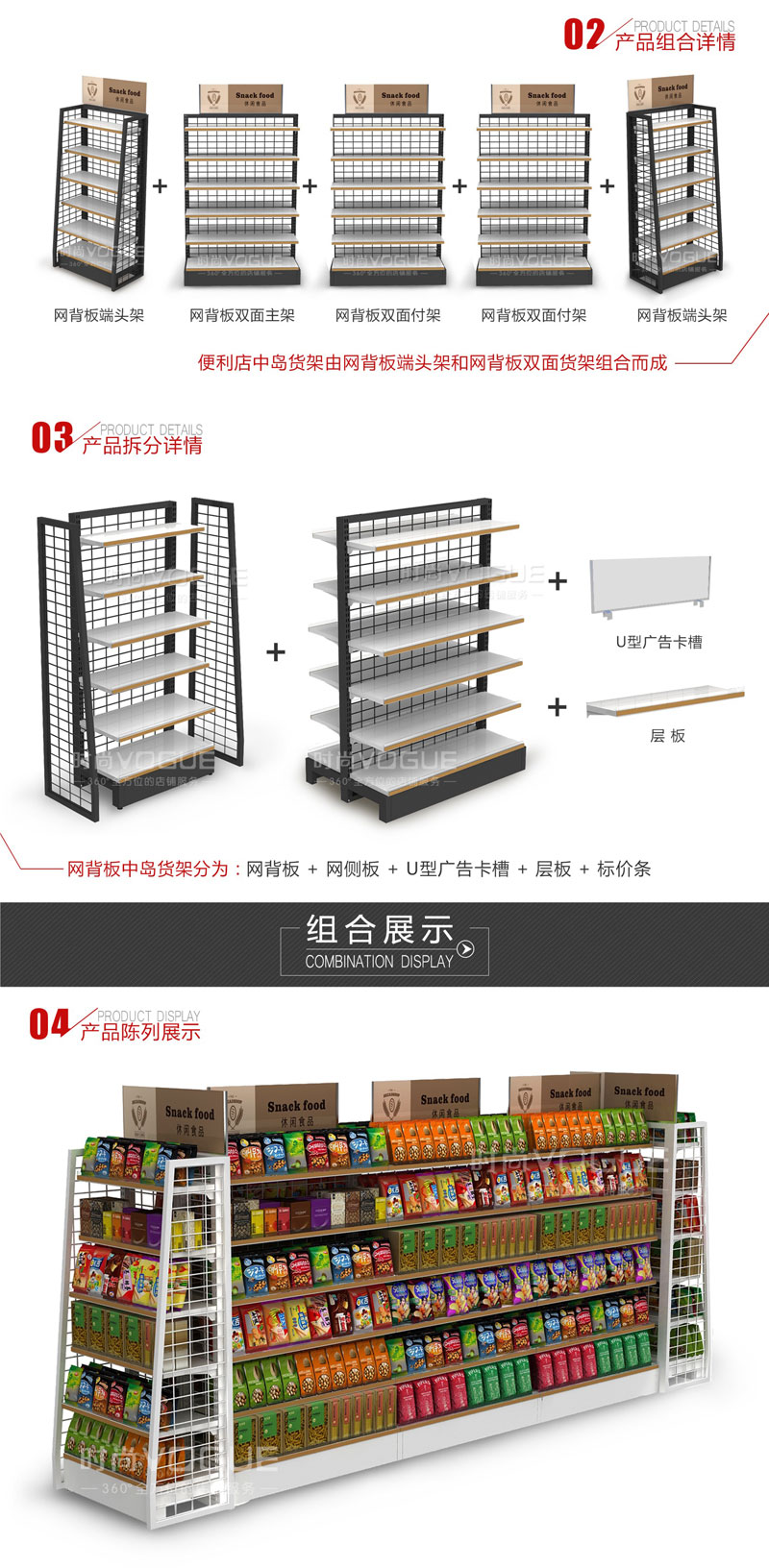 便利店零食貨架選用優質冷軋鋼板,堅固耐用,不易變形,每層可承載20kg-50kg重量物品。網背板中島貨架頂部還設計了多個廣告框,可以方便店主將安裝指示牌,讓購物更加有效率!