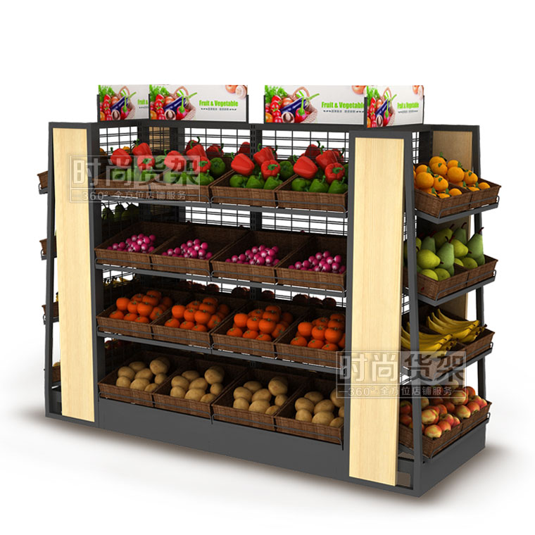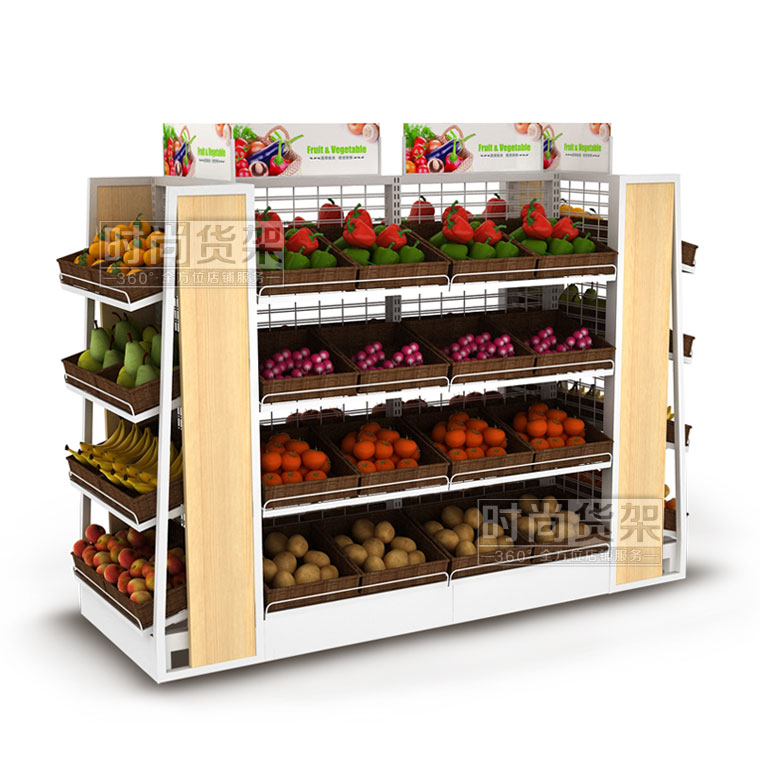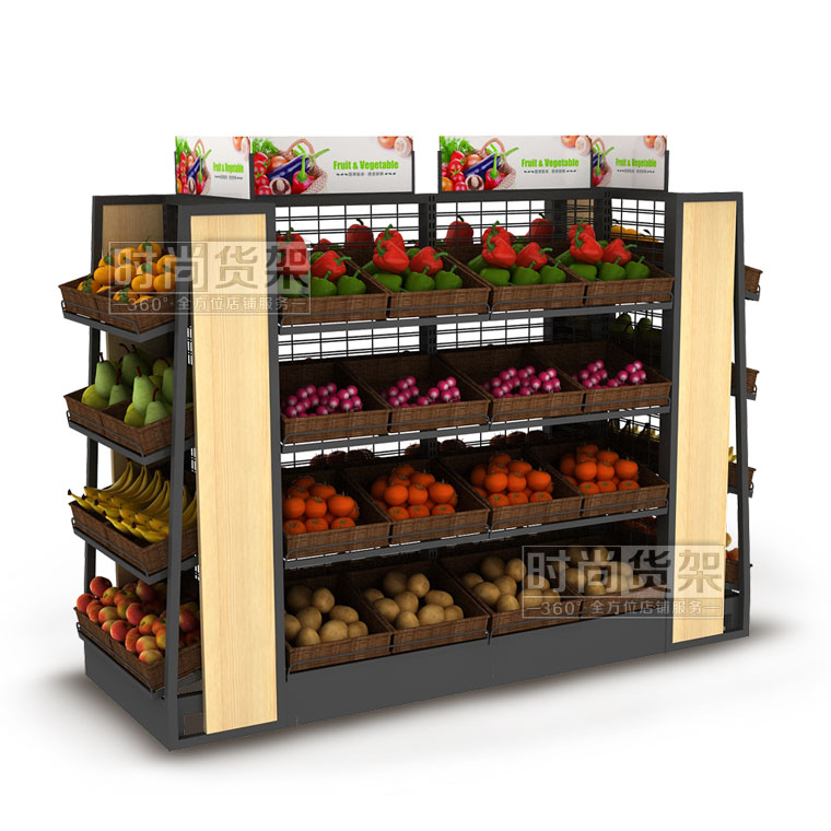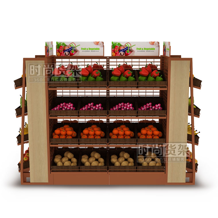 【描述】生鮮果蔬架采用加粗的鋼立柱和鋼層板,確保整個便利店蔬果架能夠長期安全承重,不變形。網狀背板設計,既保證貨架的通透性,又能減少貨架成本,一舉兩得!層板上可以搭配棕色的藤框,凸顯自然美觀。