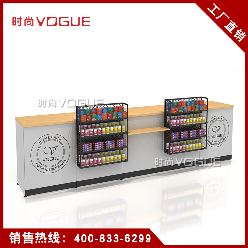 本款便利店收銀臺是時尚貨架為連鎖便利店設計生產的一款多功能組合式便利店收銀臺,如需了解更多小型便利店收銀臺,請咨詢客服人員!