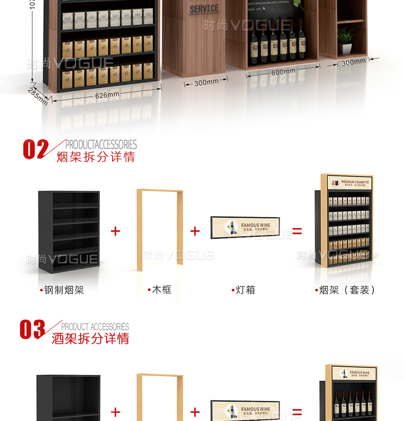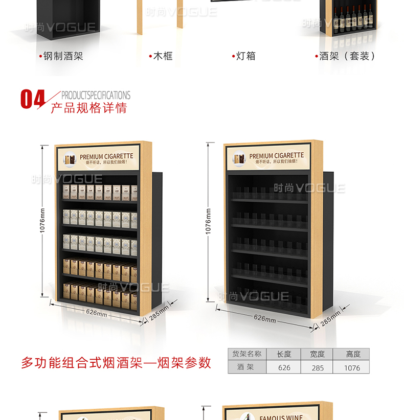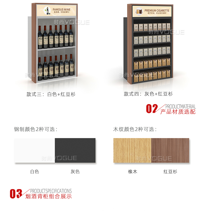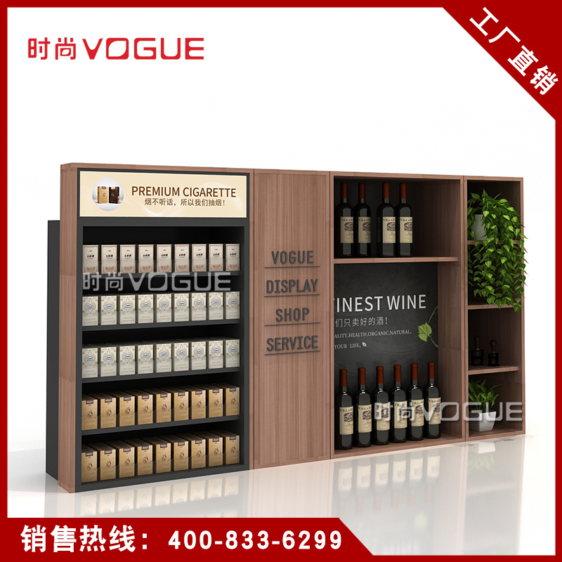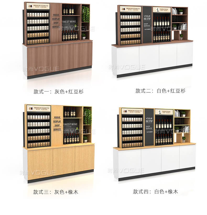 收銀臺紅酒架組合而成。便利店煙酒架立柱采用優質鋼材,具有很好的承重能力。頂部配有磁吸燈箱廣告牌,即可宣傳品牌,又可以指引顧客,讓整個收銀區的工作效率顯著提高。此款收銀區煙酒架是框架式結構,可以直接放置在收銀背柜上,穩定性和安全性很好。