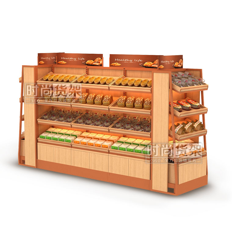 【描述】這款便利店面包貨架為雙面便利店貨架,擁有極大的商品展示面積,方便顧客更好地選購所需的商品。鋼木結合的材質選擇,讓面包架在承重性能上有著超乎想象的表現,并且時尚木質背板彰顯了貨架本身的精致與高端,更有利于打造優秀的便利店陳列展示設計。
