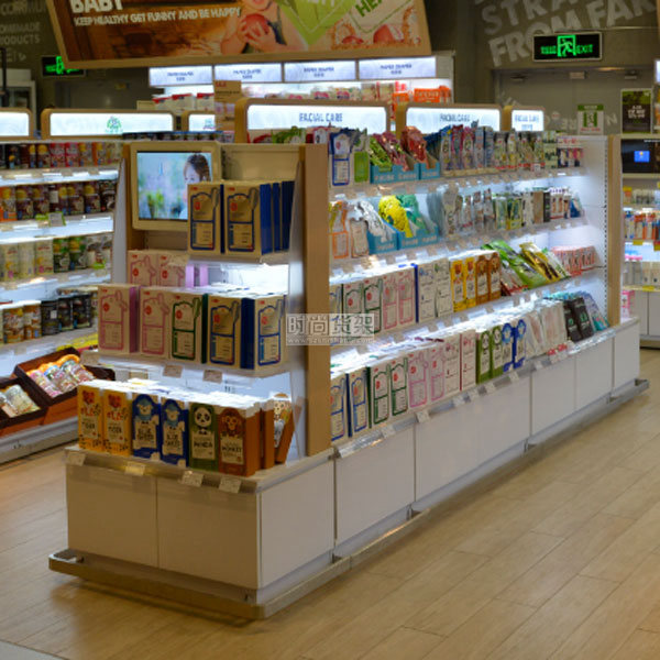 【產品名稱】鋼木結合雙面貨架/精品超市帶地柜中島貨架/精品超市中島貨架